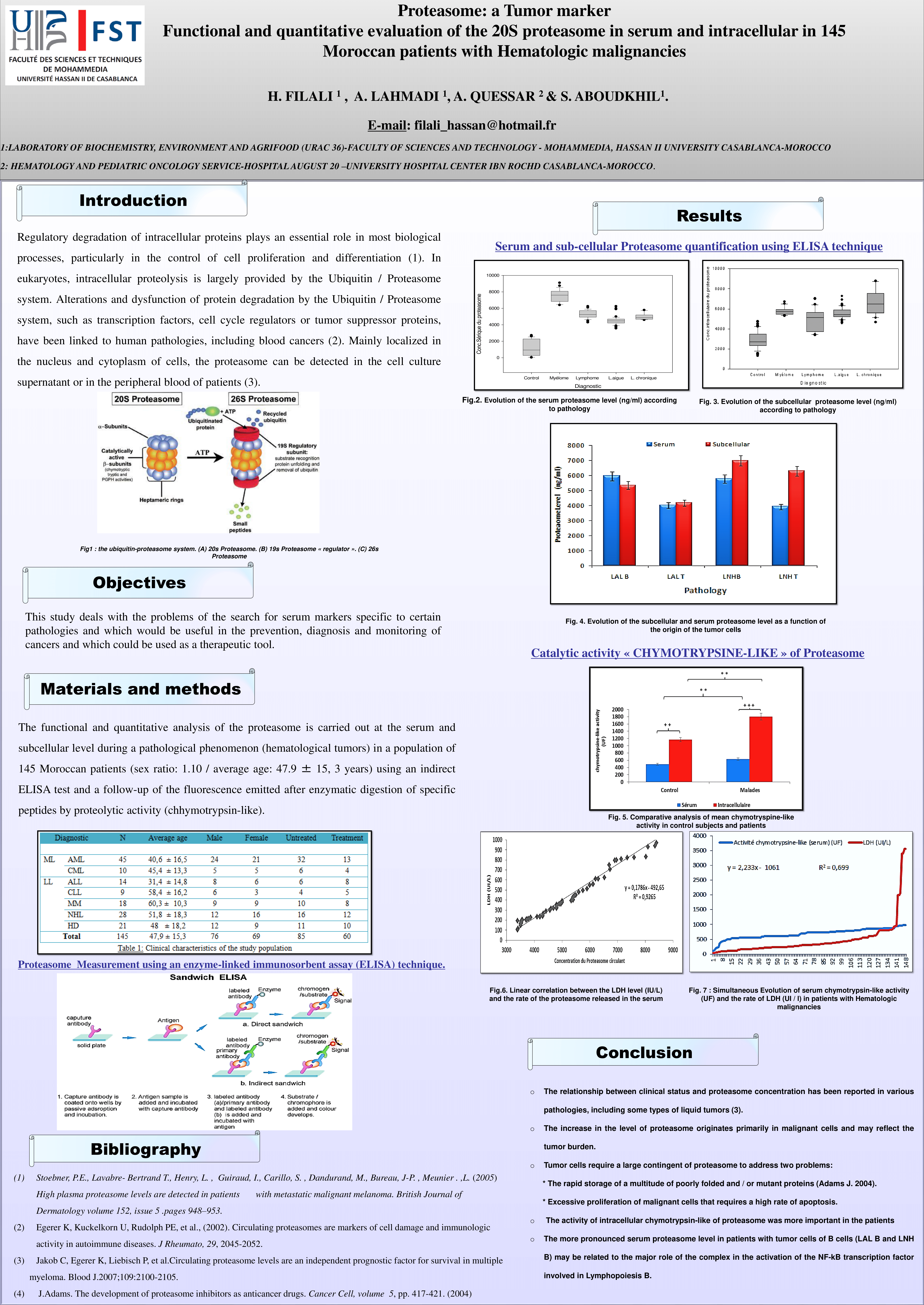 Quantitative and functional analysis of the proteasome was conducted at the subcellular level and serum during a pathological phenomenon in 145 Moroccan patients (sex ratio: 1.10 / average age: 47.9 ± 15.3 years) with ELISA assay, and by following the fluorescence emitted after enzymatic digestion of specific peptides by the chymotrypsin-like activity. This work focused on a study in a large cohort of patients with Moroccan Hematologic malignancies in order to follow the evolution of the 20S proteasome in serum and intracellular according to clinical status.