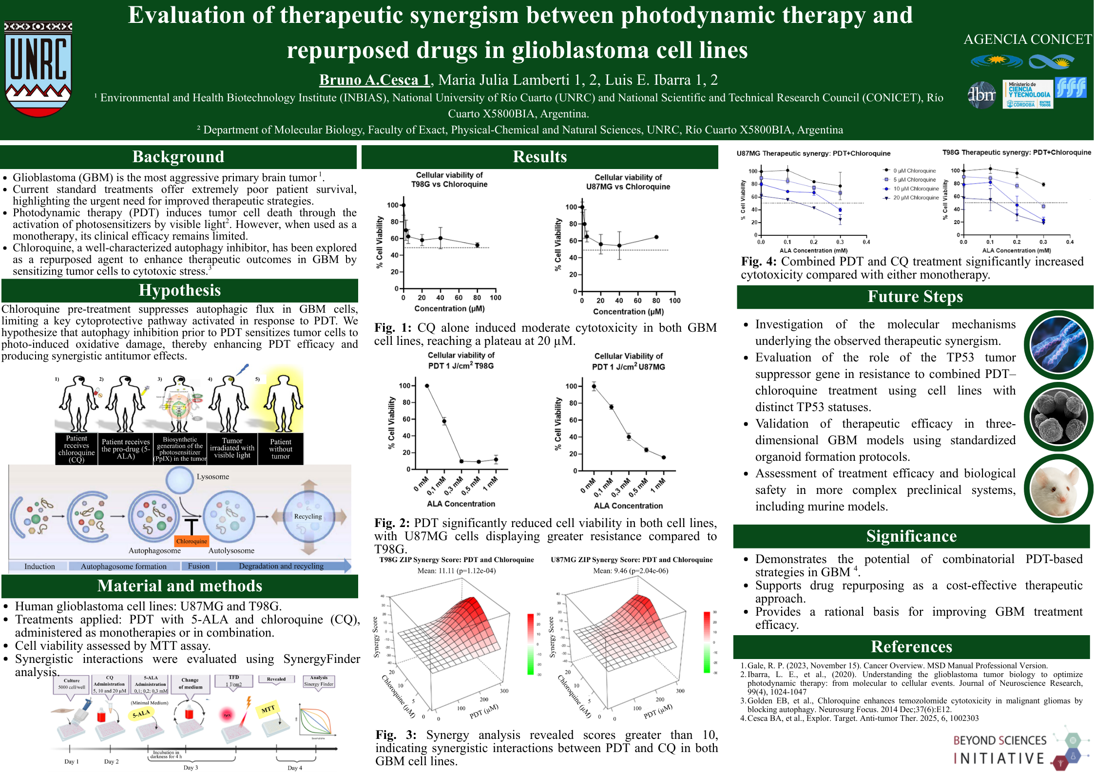 The aim of this study was to systematically evaluate this synergism in in vitro GBM models. Two widely used human GBM cell lines, U87MG and T98G, were employed. Experiments were conducted under standardized in vitro conditions, first applying monotherapies (PDT, CC, and CQ) and subsequently combining PDT with each drug. Cell viability was assessed using quantitative methodologies such as MTT, enabling compatibility with synergy analyses. All experimental conditions were performed in independent replicates and under equivalent parameters across cell lines to ensure comparability.