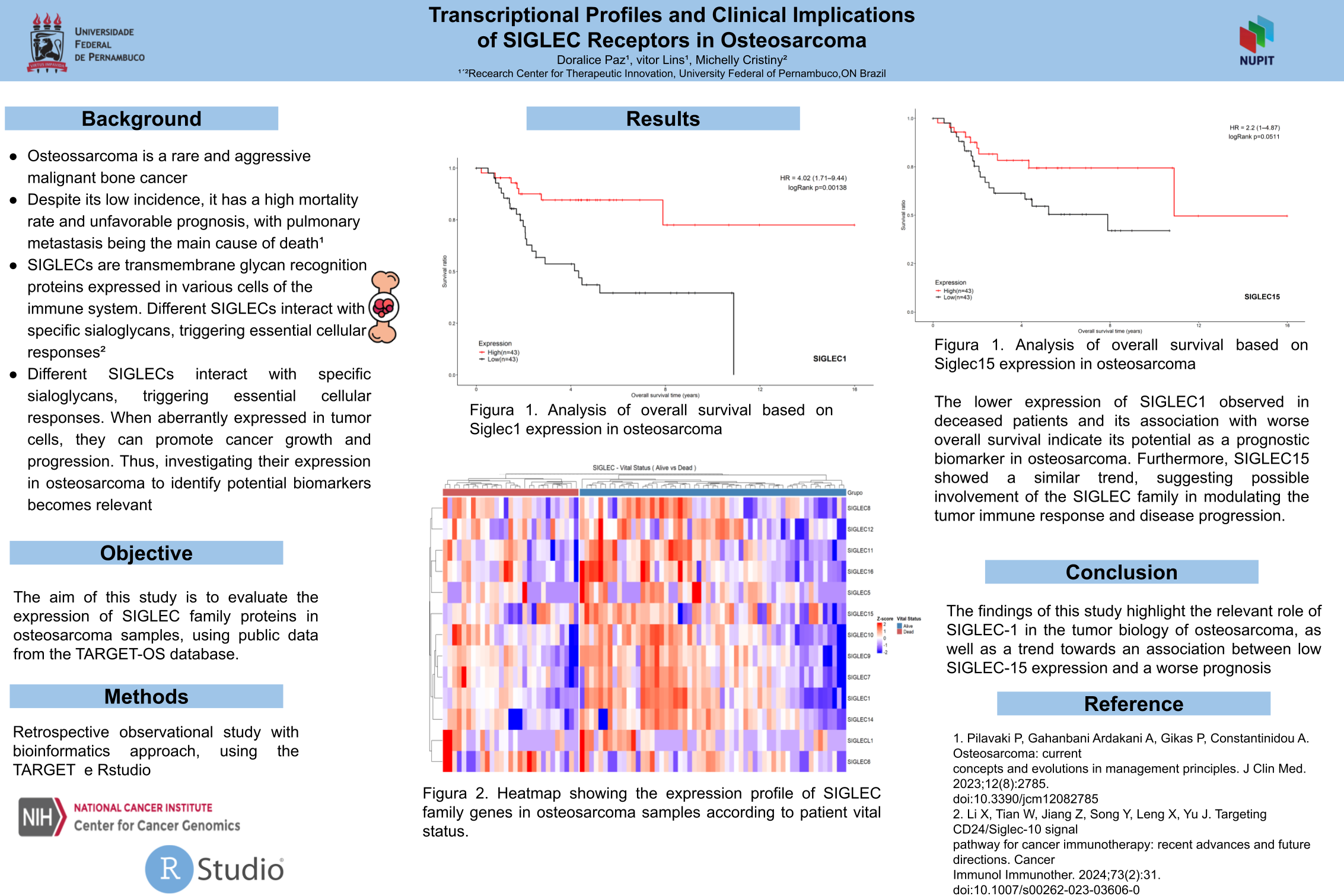 This is a retrospective observational study with a bioinformatics approach, using public data from the TARGET-OS project (Therapeutically Applicable Research to Generate Effective Treatments – Osteosarcoma). Raw gene expression data (bulk RNA-Seq) and metadata were analyzed in RStudio using the TCGAbiolinks package. A normalized expression matrix in TPM (Transcripts Per Million) was also created. The analysis of differentially expressed genes (DEGs), focusing on SIGLECs, considered two subgroups: presence or absence of metastasis and patients’ vital status. Complementarily, Kaplan-Meier analyses were performed to assess the relationship between SIGLEC expression levels and survival.