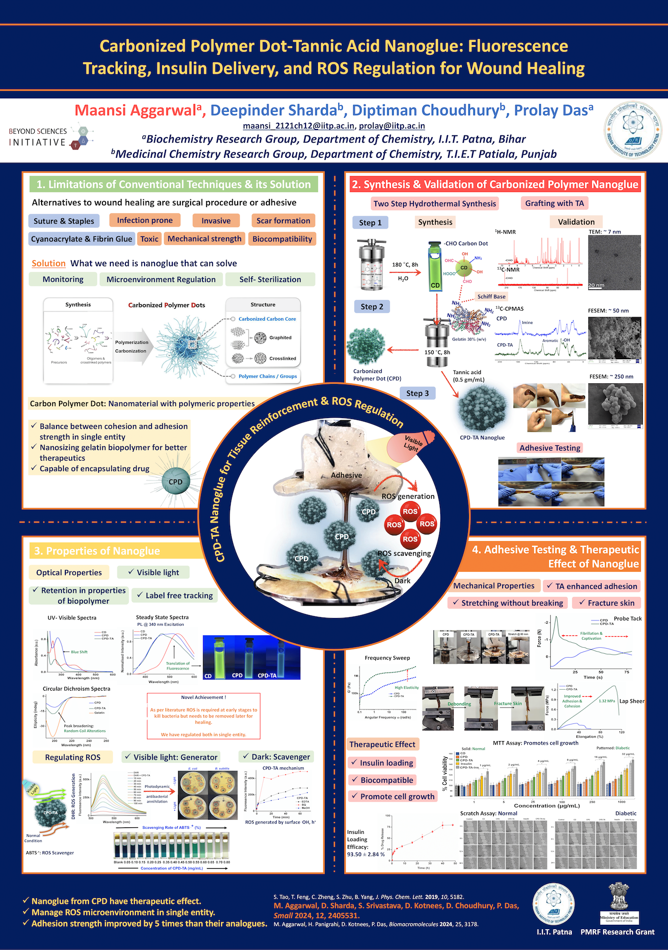 DL-Dopa, phloroglucinol, and glutaraldehyde were co-nanotized to create multifunctional CD with adhesion-relevant groups while eliminating free-aldehyde toxicity. Control studies showed that directly mixing the precursors with gelatin failed to yield an effective bioglue, confirming the need for nanotization. CPD-TA was produced via TA grafting, verified by TEM and FESEM, and physico-mechanical tests (rheology, probe tack, lap shear) demonstrated an optimized adhesion–cohesion balance with 1.32 MPa strength. CPD-TA exhibited strong photoluminescence for optical tracking and enabled effective insulin loading and delivery. Combination-index analysis revealed synergistic wound-healing performance, supported by cell-migration, antibacterial, and cytocompatibility assays. Notably, CPD-TA generated ROS under visible light for self-sterilization and scavenged ROS in darkness, enabling dual-mode therapeutic functionality.