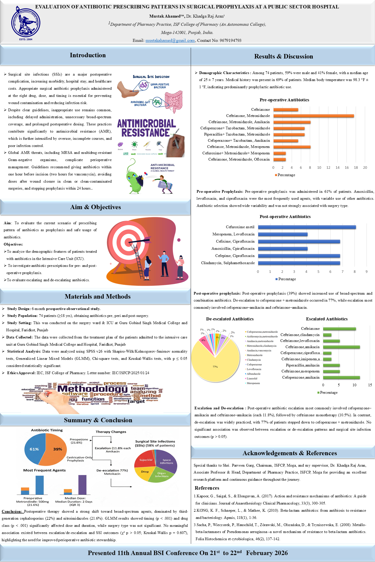 The research shows significant non-conformity to the recommended surgical antibiotic prophylaxis protocols, especially in terms of duration and continuance after surgery. Culture-based de-escalation minimized the occurrence of SSI as well as hospitalization and antibiotics. Enhancing the adoption of antibiotic stewardship practices in the surgical environment can improve treatment outcomes and prevent antimicrobial resistance.