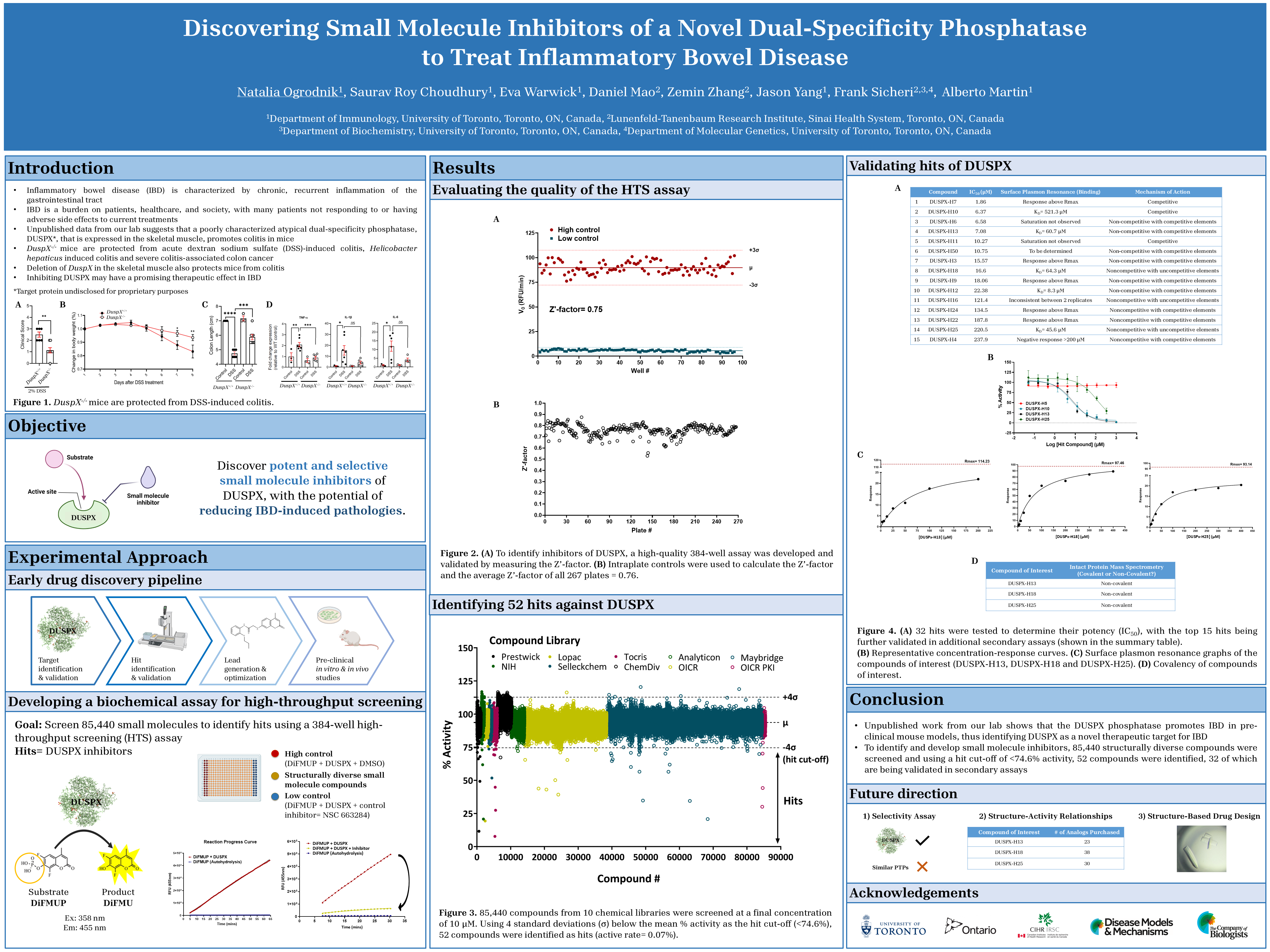 Canada has one of the highest rates of inflammatory bowel disease (IBD) worldwide, affecting nearly 1% of Canadians. IBD is a burden on patients, healthcare and society, and with many patients not responding to and/or having adverse side effects to current treatments, novel therapeutics are needed. Consisting of Crohn’s disease and ulcerative colitis, IBD is characterized by chronic, recurrent inflammation of the gastrointestinal tract. Although various genetic and environmental factors have been implicated, the cause of IBD is unknown. Numerous genes are associated with IBD, but many have yet to be explored, such as the DUSPX* locus. Unpublished work from our lab shows that the DUSPX phosphatase promotes IBD in pre-clinical mouse models, supporting GWAS studies linking this gene to IBD. Thus, our work identified DUSPX as a novel therapeutic target for IBD. Historically, phosphatases were deemed ‘undruggable’, however, recent developments in orally deliverable small molecule inhibitors that selectively target phosphatases in cancer and autoimmune diseases has spurred renewed interest in these enzymes. This has initiated our lab to discover potent and selective small molecule inhibitors of DUSPX and assess whether these inhibitors can reproduce the biological findings observed in mice deficient in DUSPX.